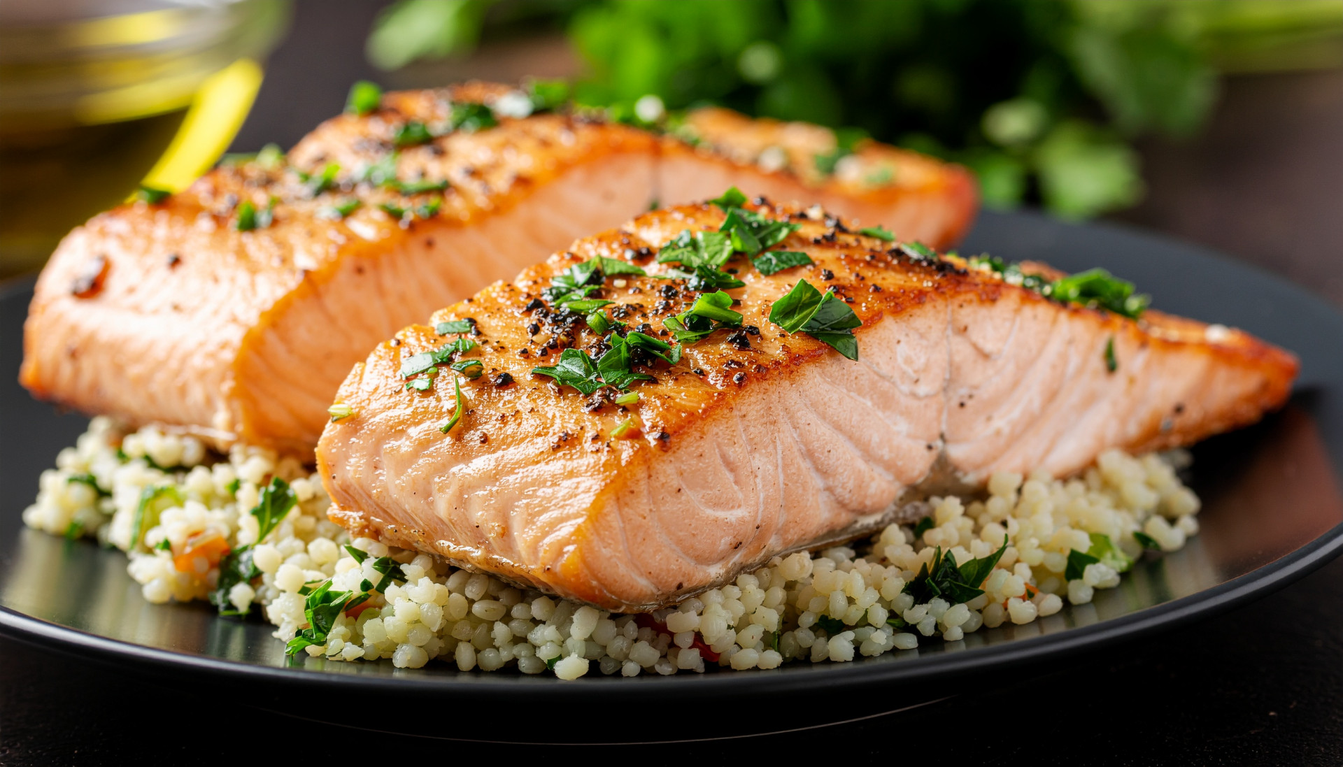 - Plate the herbed couscous as your base, then angle the salmon above it for dramatic presentation.