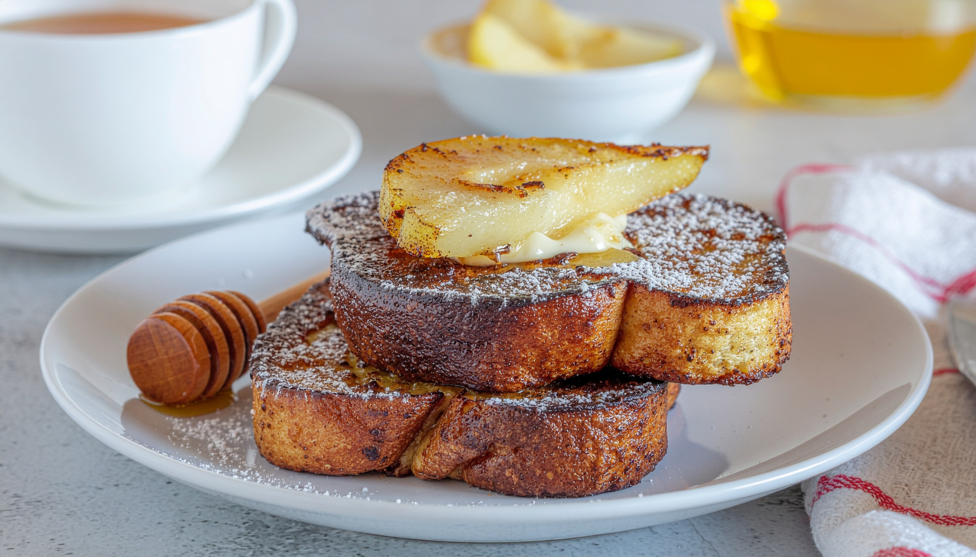 Start your week with luxurious French toast that feels like a fancy brunch. The rich brioche soaked in vanilla-cinnamon custard pairs perfectly with sweet caramelized pears and homemade honey butter for ultimate comfort.