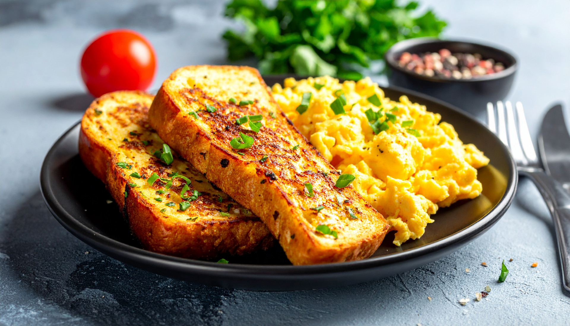 - Serve the savory French toast with the soft scrambled eggs on the side.