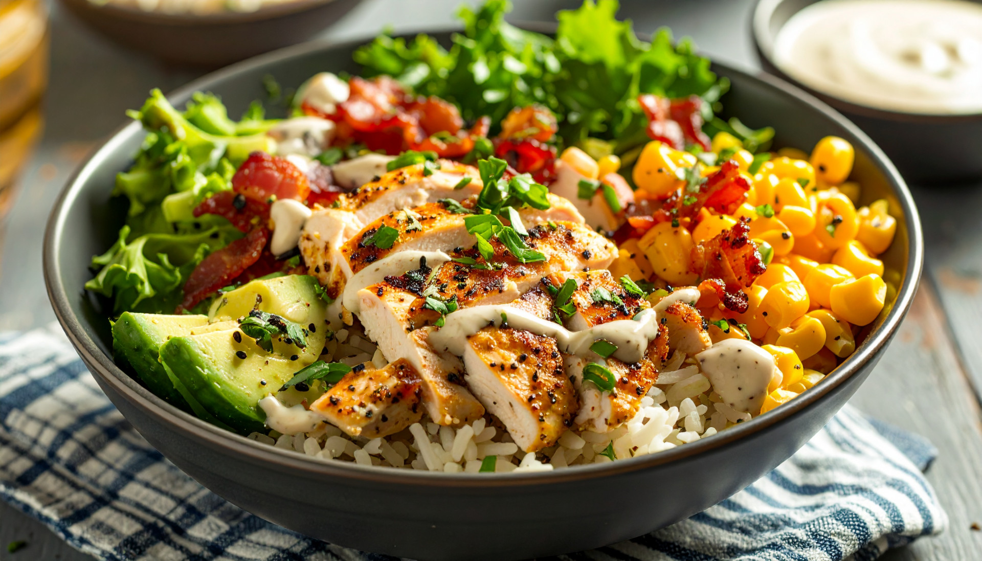 A deconstructed salad bowl that combines warm, savory chicken and crispy turkey bacon with cool, fresh lettuce and tomato. The light yogurt-based ranch dressing ties everything together for a lunch that’s both comforting and refreshing.