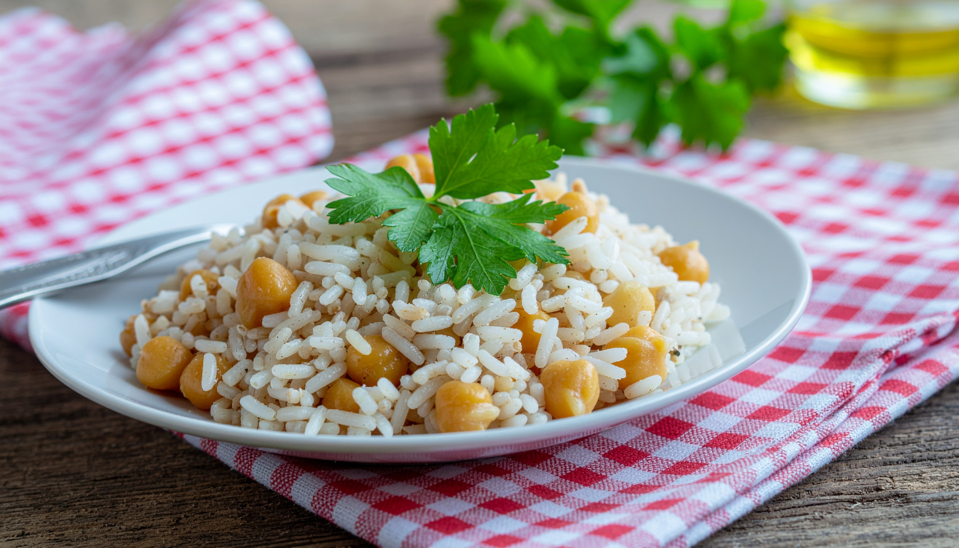 - Place warm rice in a bowl and top with the savory garlic chickpeas. Season with salt and pepper.