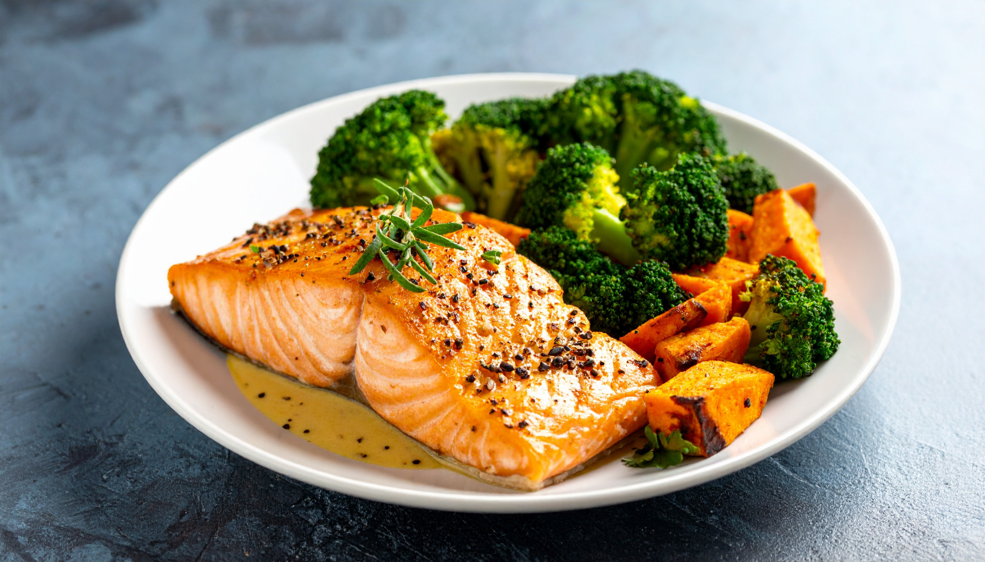 - Serve the salmon alongside the roasted sweet potato and broccoli. Spoon any pan juices over the top.